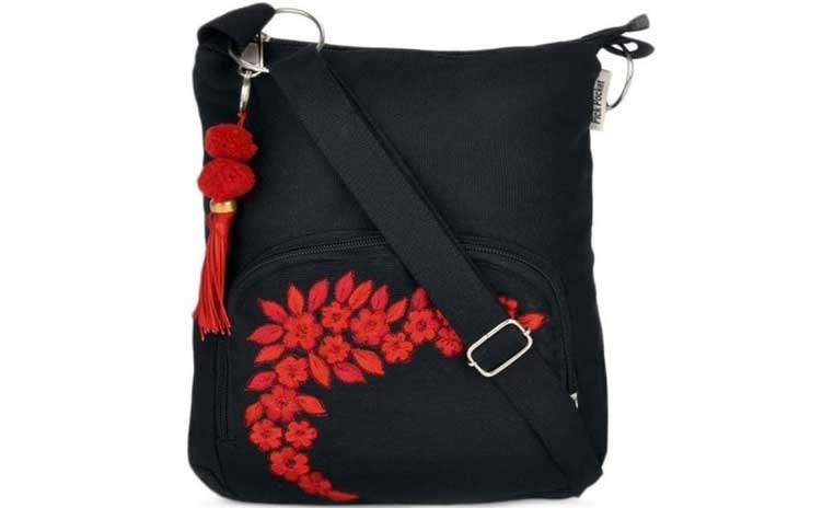 Black small sling bag with zipper in canvas material. Adjustable handle. With red flower shaped work and red matching tassel. with 2 zipper pockets